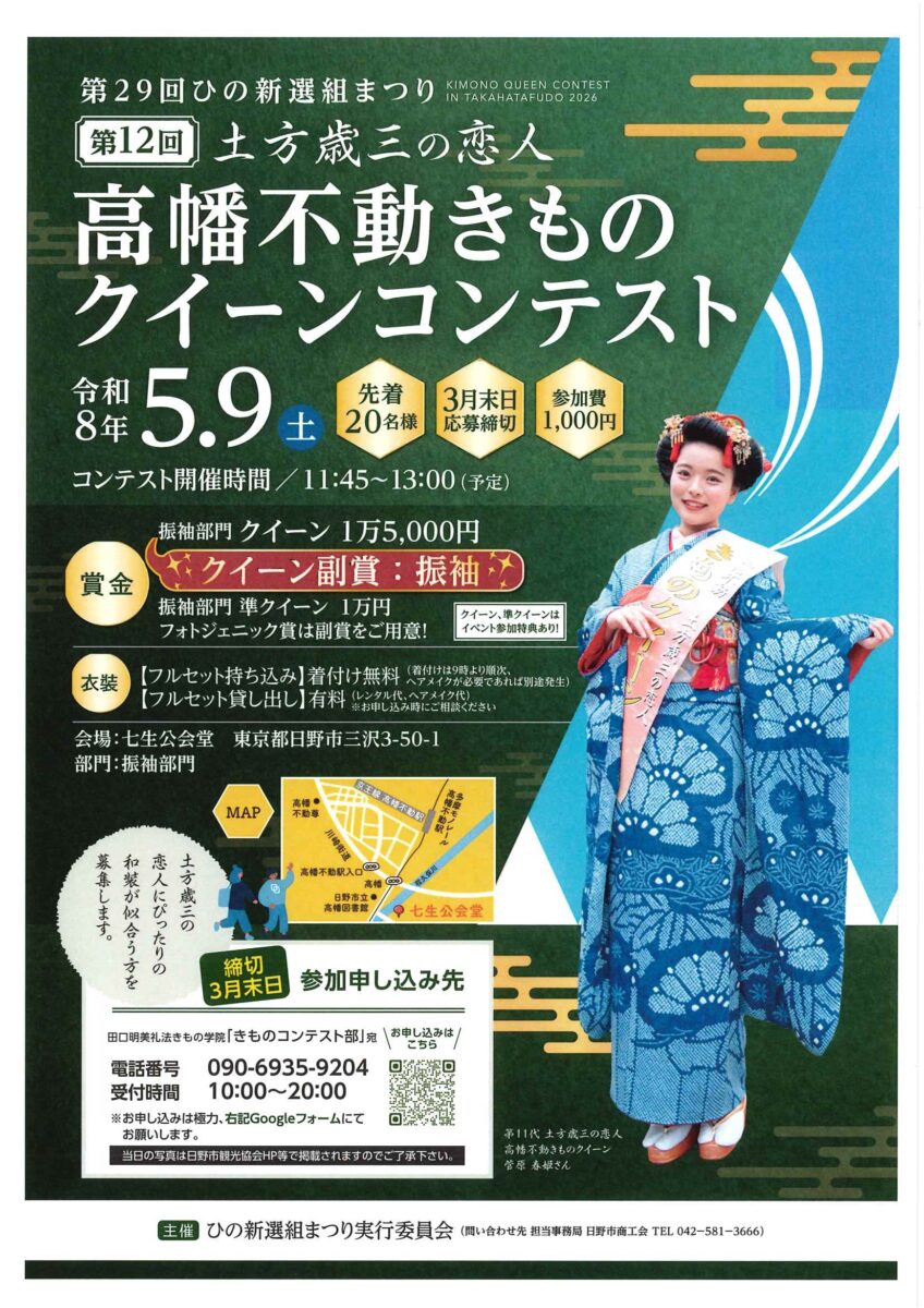 5月9日(土)、新選組隊士コンテストが行われる七生公会堂で「第12回土方歳三の恋人・高幡不動きものクイーンコンテスト」が開催されます。 昨年まで着物姿で高幡不動のまちを盛り上げていただいた普段着部門、ファミリー部門がなく […]