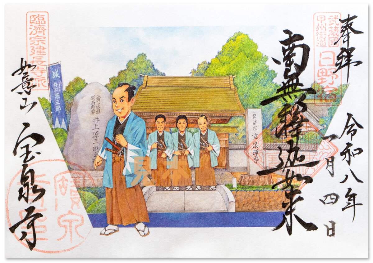 新選組隊士の供養のために描かれた御朱印には、旧甲州街道に面した宝泉寺山門前に居並ぶ、共に日野宿で剣術を修練した、井上源三郎、近藤勇、土方歳三、沖田総司の4人の姿。