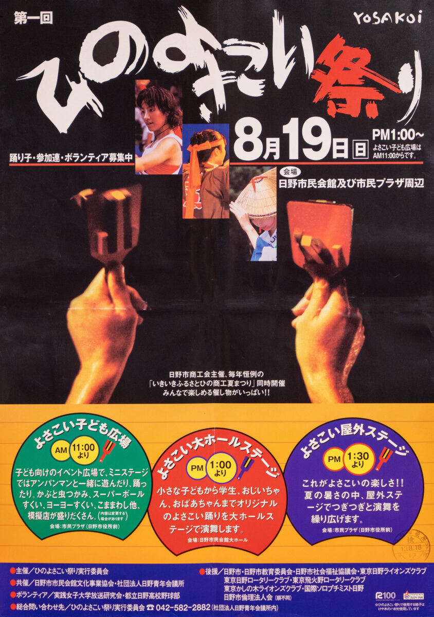 平成13年(2001)8月19日、「いきいきふるさとひの商工夏祭り」の一環行事として日野市青年会議所が「ひのよさこい祭り実行委員会」を組織し、日野市民会館大ホールで「ひのよさこい祭り」を行いました。