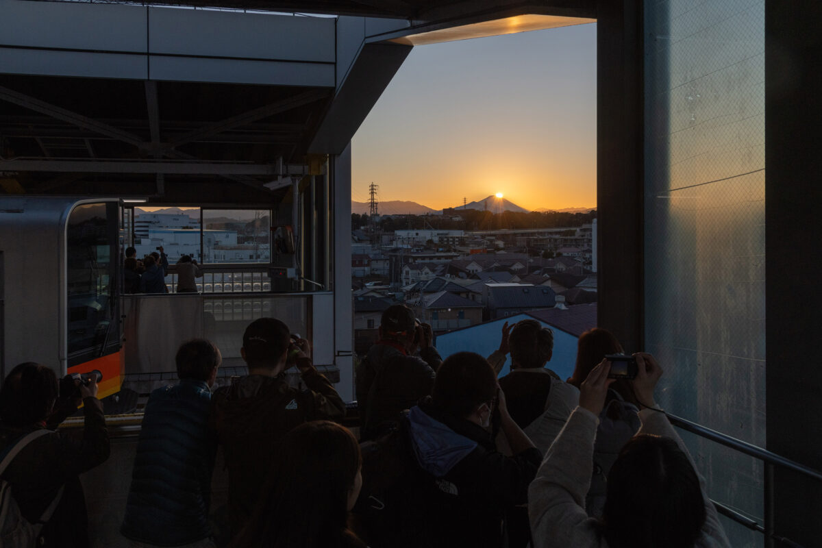 多摩モノレール柴崎体育館駅、甲州街道駅、そして万願寺駅ホームからは「ダイヤモンド富士」が見られ、多摩モノレールHPには「ダイヤモンド富士」特設サイトが設けられています。