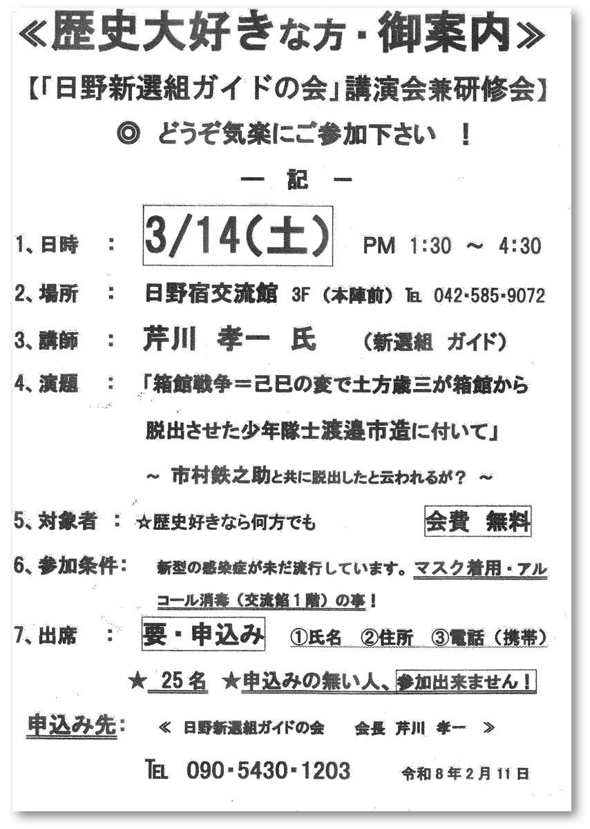 日野新選組ガイドの会による講演会が行われます。歴史大好きな方気楽にご参加下さい。