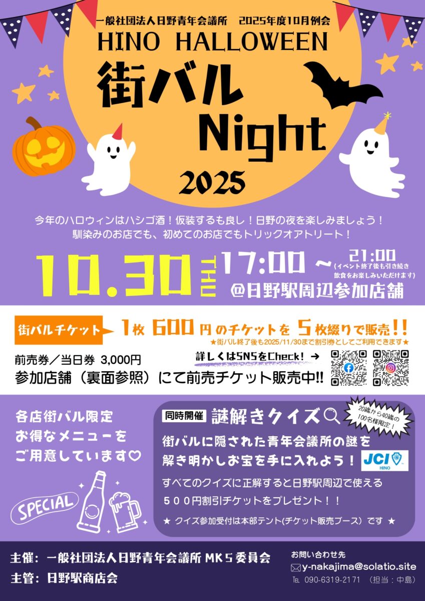 10月31日はHALLOWEEN 、その前日、30日にはJR日野駅周辺にある15軒のお店で街バル Night 。