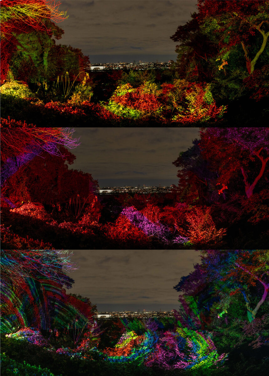 刻々と「色合いを変えるデジタル掛軸」、場所によっては下界の夜景と一体となった圧倒的な描写、寒いのも忘れるほど皆さんを魅了します。