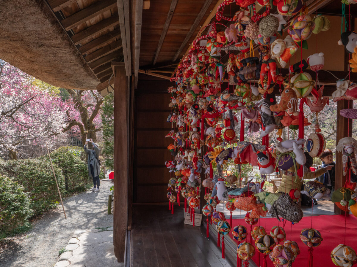 園内の「松蓮庵」では季節に合わせた「雛人形・つるし雛展」、梅まつりでは初見、帝京大学書道部による「書道パフォーマンス」が園内の梅と競演します。