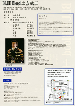 第22回ひの新選組まつり、初日5月11日(土)、ひの煉瓦ホール(日野市民会館)では恒例となっているL.PRODUCTSとさくらさくらカンパニーの友情公演に加え、重要無形文化総合指定保持者・観世流能楽師の山中迓晶氏が、土方歳三没後150年を機に、新作能を初演します。