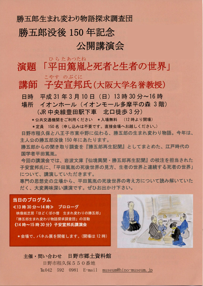 日野市程久保には「勝五郎生まれ変わり」の伝承あります。 今年は主人公の勝五郎没後150年にあたります。 江戸時代の国文学者平田篤胤が『勝五郎再生記聞』として世に残した「勝五郎生まれ変わり物語」。 「平田篤胤と死者と生者の […]